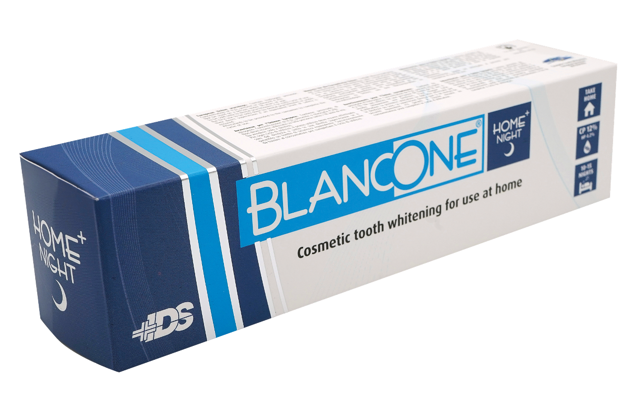 BlancOne® HOME Night Single für die Anwendung nachts - basiert auf Carbamid Peroxid 12% (5,6% HP) und nutzt einen speziellen Vitamin Booster aus Vit. D und K, sowie Nano Hydroxylapatit, um der Demineralisierung während des Bleachings entgegenzuwirken. In Kombination mit verschiedenen Peroxid – Konzentrationen kommt es zu einem synergetischen Effekt, der ein extrem regeneratives Umfeld während des Bleaching Prozesses generiert und sogar den Zahnschmelz stärkt.